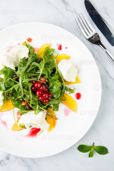 Зеленый салат с рукколой и брусникой на белой тарелке и мраморном фоне, вид сверху