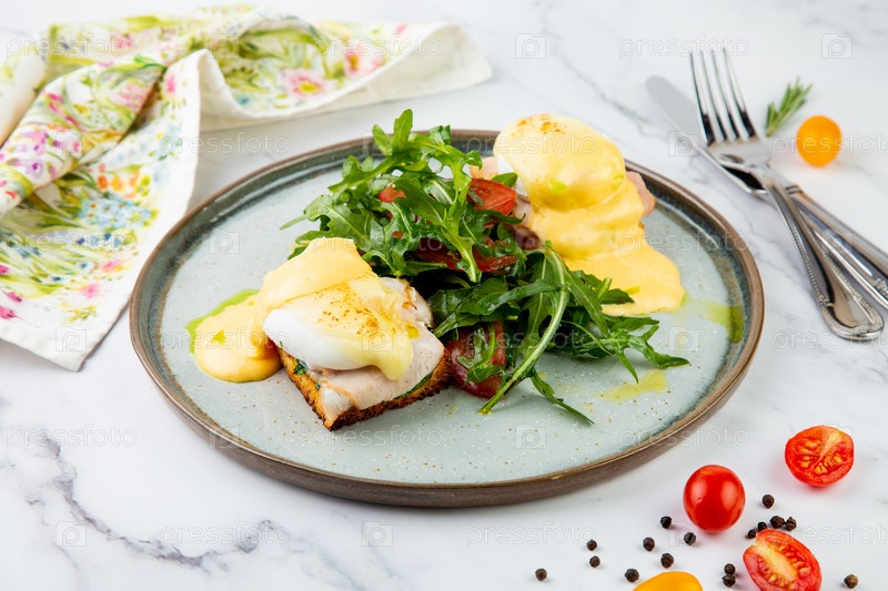 Завтрак. Тост с отварной свининой, сыром, яйцом-пашот и салатом из рукколы и помидоров, заправленным сливочным маслом
