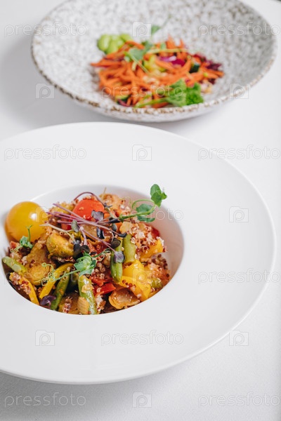 Овощное рагу с картофелем, помидорами и зеленью с соусом в глубокой тарелке, вид сбоку