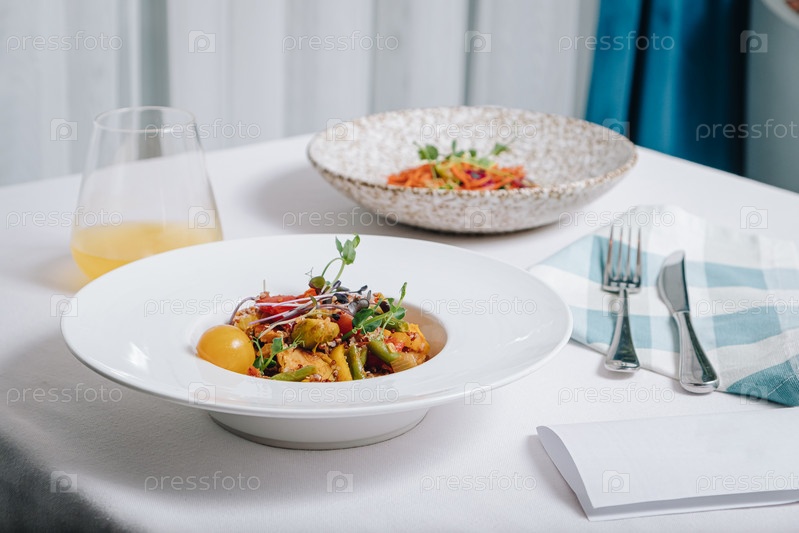 Овощное рагу с картофелем, помидорами и зеленью с соусом в глубокой тарелке, вид сбоку