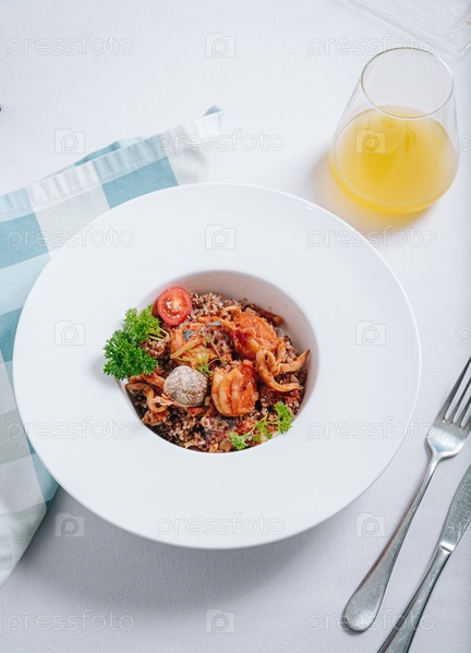 Гречка с морепродуктами, устрицами, помидорами и зеленью в глубокой тарелке, вид сверху