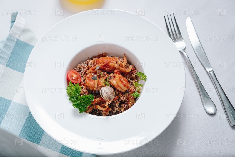 Гречка с морепродуктами, устрицами, помидорами и зеленью в глубокой тарелке, вид сбоку