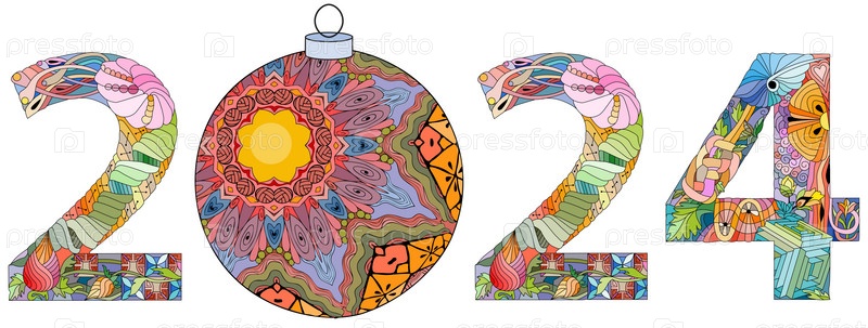 Дизайн номера 2024 года с рождественским шаром. Симпатичная векторная иллюстрация для украшения