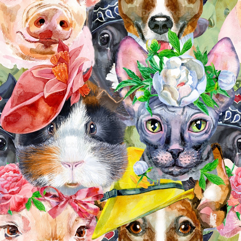 Бесшовный рисунок домашних животных. Ручная роспись акварельным рисунком, изолировать клип на белом фоне
