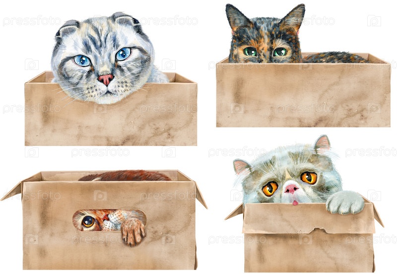 Набор портретов забавного кота, выглядывающего из коробки. Акварельная иллюстрация