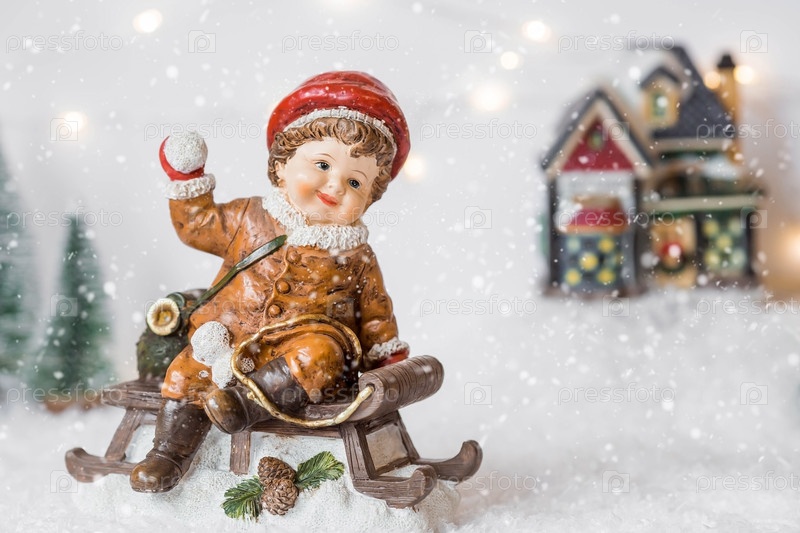Ретро-рождественская открытка с милой фигуркой ребенка на деревянных санях на красивом заснеженном фоне. Мальчик Б играет в снежки. Концепция зимнего праздника Нового 2024 года