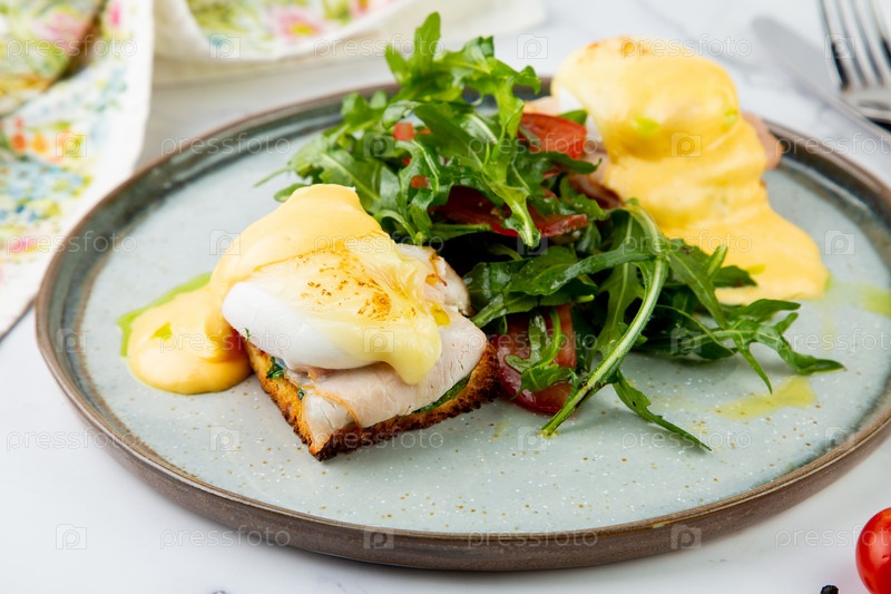 Завтрак. Тост с отварной свининой, сыром, яйцом-пашот и салатом из рукколы и помидоров, заправленным сливочным маслом