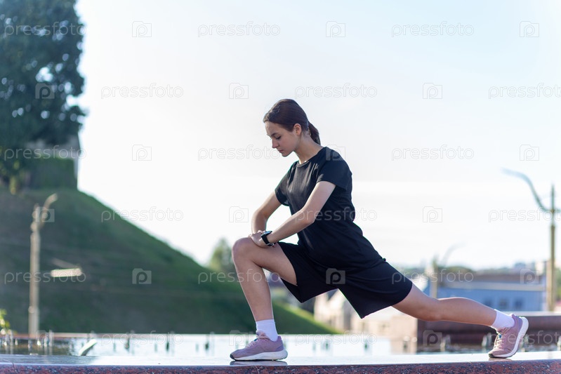 Молодая, подтянутая и спортивная девушка в черной одежде растягивается после тренировки возле общественного фонтана в городском парке. Фитнес, спорт, городской бег и концепция здорового образа жизни