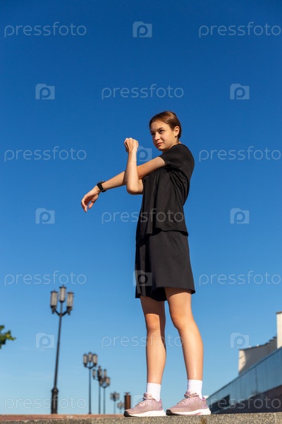 Молодая, подтянутая и спортивная девушка в черной одежде растягивается после тренировки в городском парке