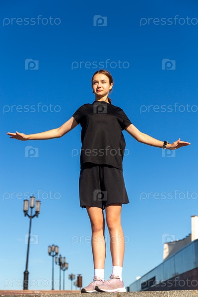 Молодая, подтянутая и спортивная девушка в черной одежде растягивается после тренировки в городском парке