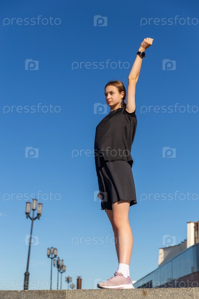 Молодая, подтянутая и спортивная девушка в черной одежде растягивается после тренировки в городском парке