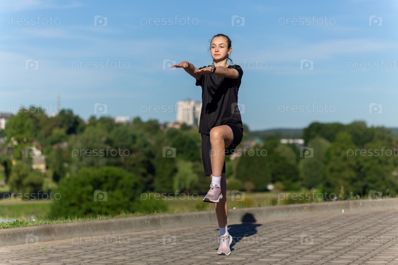 Молодая, подтянутая и спортивная девушка в черной одежде растягивается после тренировки в городском парке