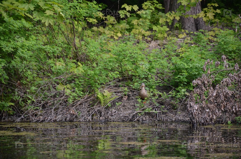 Утка кряква среди зарослей кустарника и травы спускается к воде