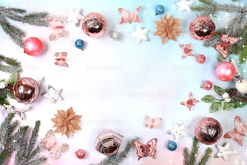 Красивый рождественский и новогодний баннер с огнями, украшениями, игрушками, бабочками с еловыми ветками с местом для текста. Праздничная открытка, макет экрана, фон, настройка продукта для праздничной рекламы, концепция сочельника,