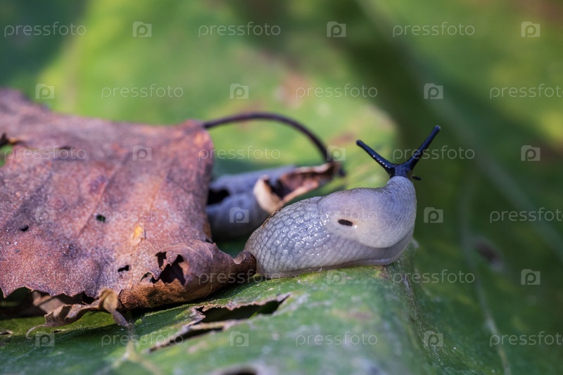 Слизняк на листе в саду