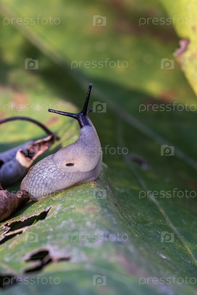 Слизняк на листе в саду