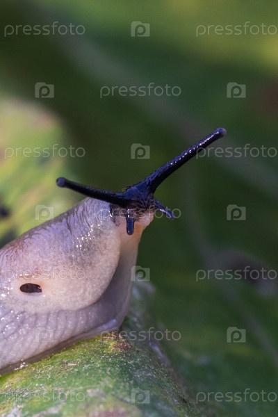 Слизняк на листе в саду