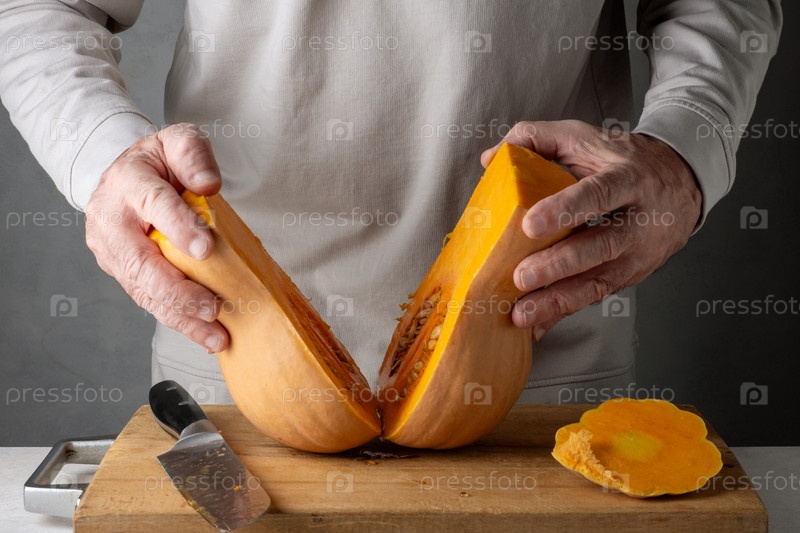 Мужчина режет тыкву на деревянной разделочной доске. Селективный фокус