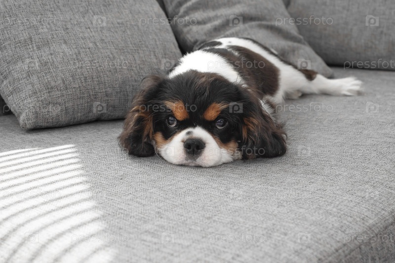 Портрет красивого кавалер-спаниеля. Милый щенок отдыхает на диване
