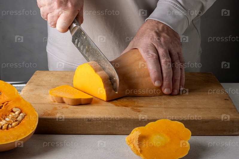 Мужчина режет тыкву на деревянной разделочной доске. Селективный фокус
