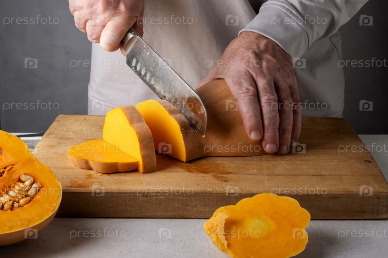 Мужчина режет тыкву на деревянной разделочной доске. Селективный фокус