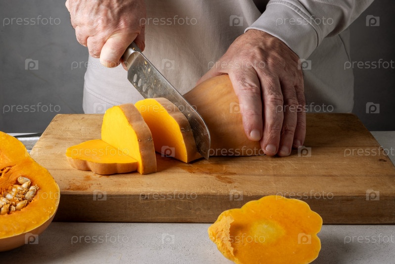 Мужчина режет тыкву на деревянной разделочной доске. Селективный фокус