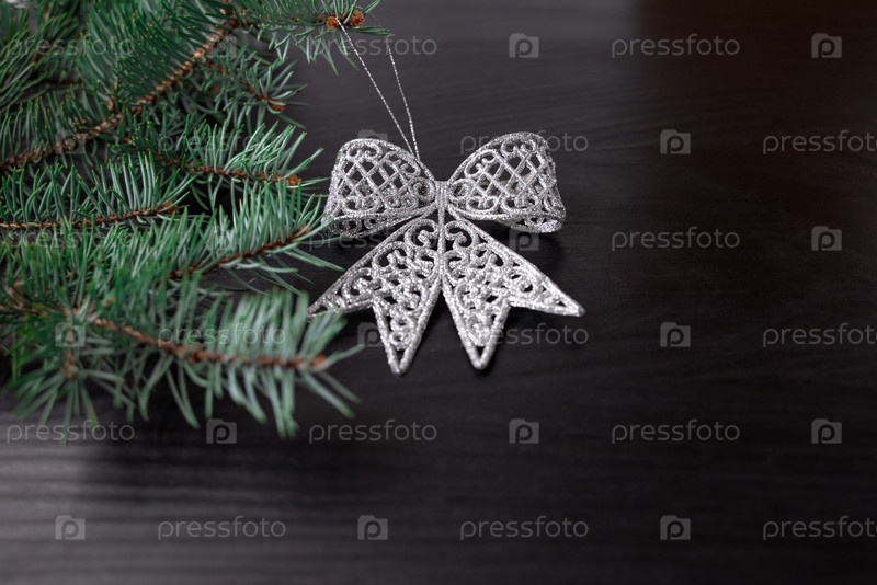 Еловая ветка, украшенная бантом на черном фоне
