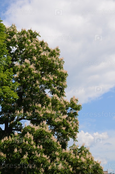 цветущее каштановое дерево на фоне голубого неба и облаков каштан