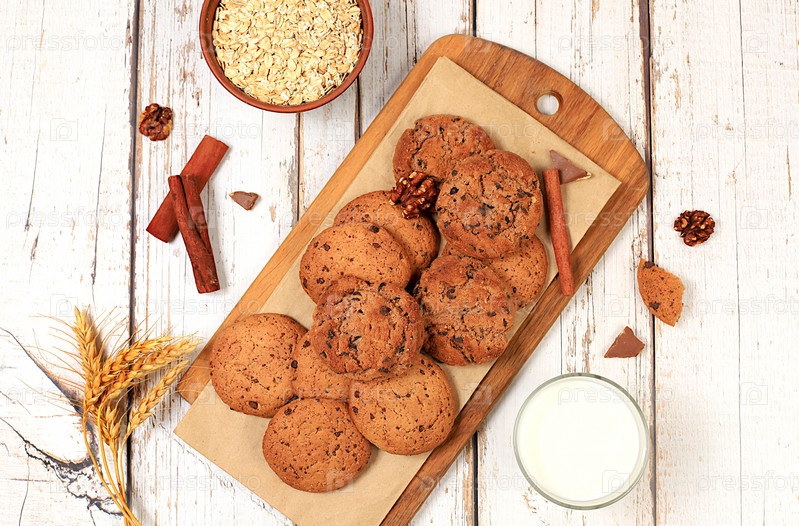 Домашнее овсяное печенье с шоколадной крошкой и орехами без глютена с ушами на деревянном фоне, современная пекарня и концепция зерновых продуктов. Здоровый завтрак с ингредиентами, вид сверху, выборочный фокус,