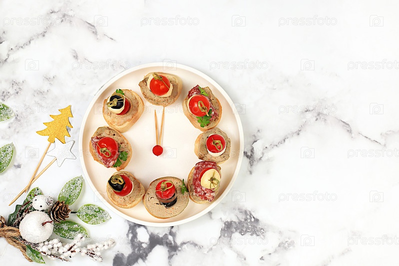 Рождественские и новогодние блюда, набор закусок для праздничного стола. Тарелка с канапе в форме часов из помидоров, паштета, сыра моцарелла, салями, оливок, черных оливок и винограда на мраморном столе, выборочный фокус