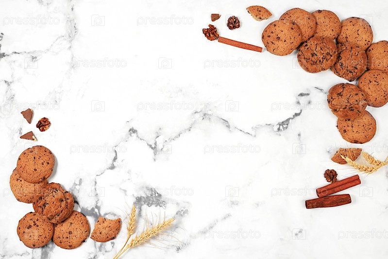 Свежеиспеченное домашнее овсяное печенье с шоколадной крошкой и орехами без глютена с ушами на мраморном фоне, современная пекарня и концепция зерновых продуктов. Здоровый завтрак с ингредиентами, вид сверху, выборочный фокус,