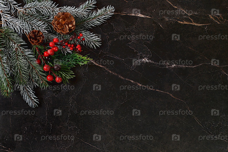 Рождество и Новый год 2024 фон с еловыми ветвями, покрытыми снежинками на темном мраморном столе, баннер для праздничного экрана, шаблон для дизайна. Праздничная открытка,