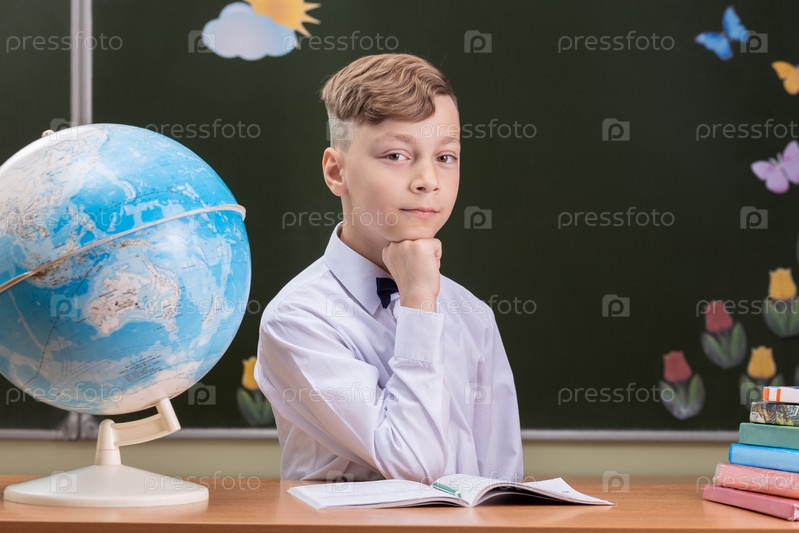 Красивый счастливый школьник сидит за партой на фоне доски