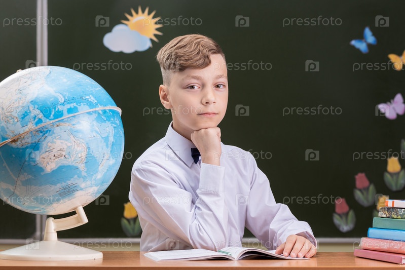 Красивый счастливый школьник сидит за столом
