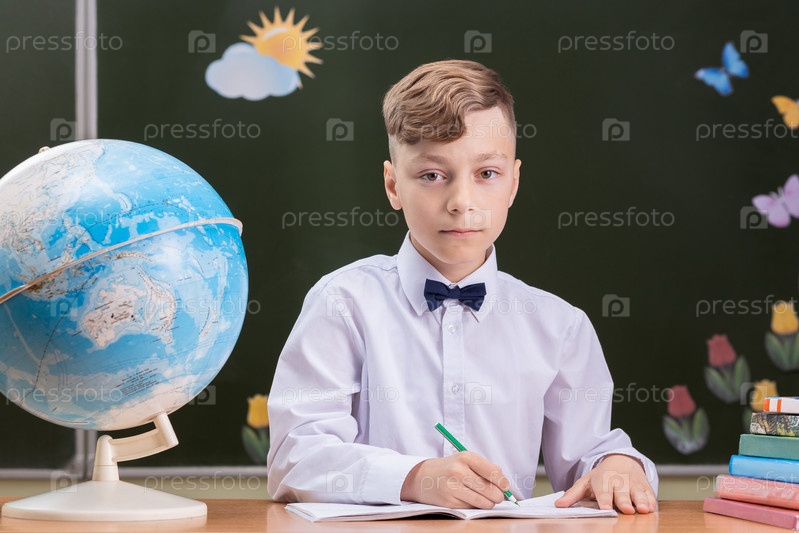 Красивый счастливый школьник сидит за партой и держит ручку в руке на фоне доски