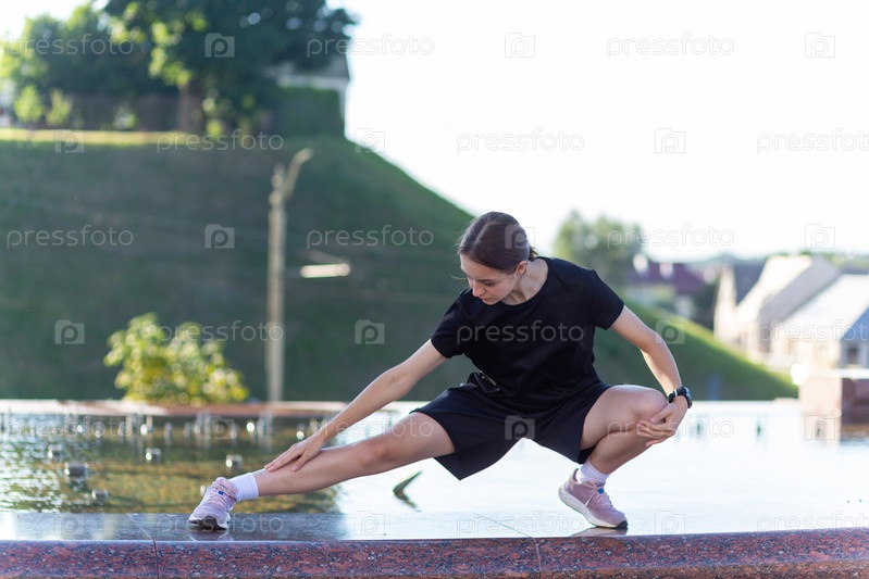 Молодая, подтянутая и спортивная девушка в черной одежде растягивается после тренировки возле общественного фонтана в городском парке. Фитнес, спорт, городской бег и концепция здорового образа жизни