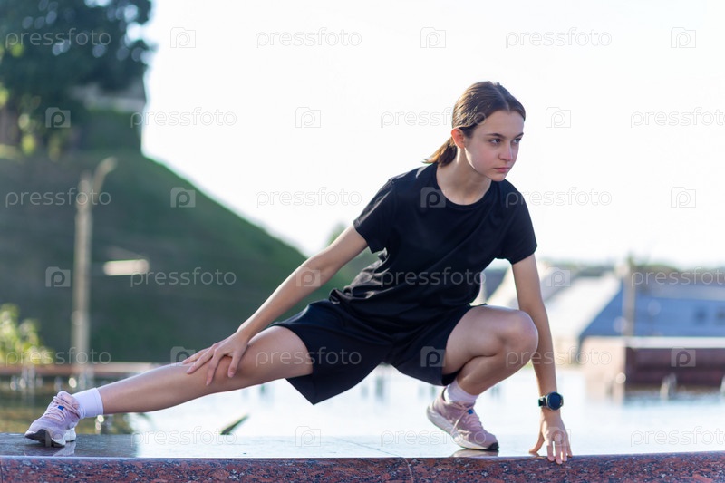 Молодая, подтянутая и спортивная девушка в черной одежде растягивается после тренировки возле общественного фонтана в городском парке. Фитнес, спорт, городской бег и концепция здорового образа жизни