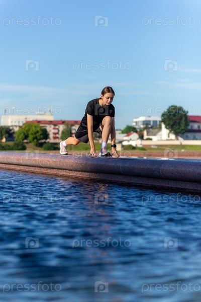 Молодая, подтянутая и спортивная девушка в черной одежде растягивается после тренировки возле общественного фонтана в городском парке. Фитнес, спорт, городской бег и концепция здорового образа жизни