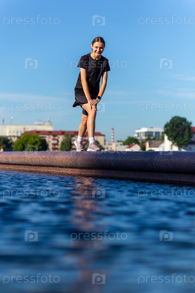 Молодая, подтянутая и спортивная девушка в черной одежде растягивается после тренировки возле общественного фонтана в городском парке. Фитнес, спорт, городской бег и концепция здорового образа жизни