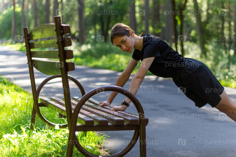 Красивая молодая спортивная женщина в черной футболке, черных шортах и розовых кроссовках разминается, тренируя трицепсы и грудь, отжимаясь от скамейки среди деревьев перед бегом