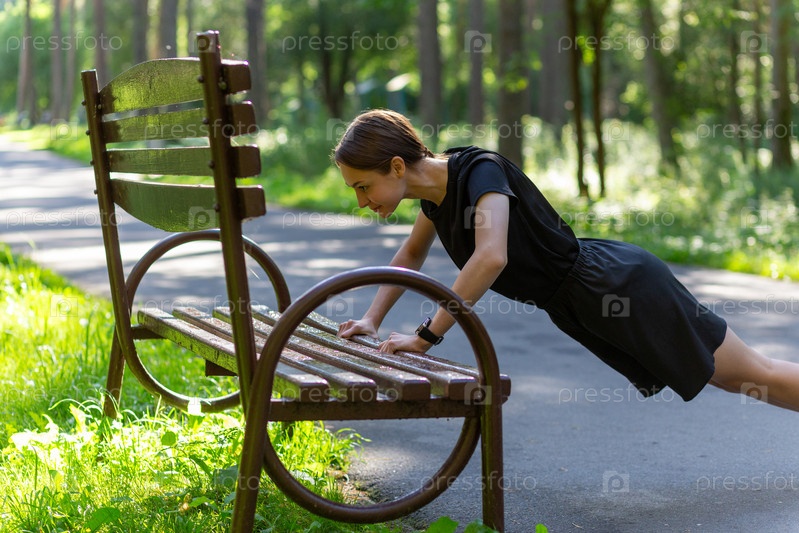 Красивая молодая спортивная женщина в черной футболке, черных шортах и розовых кроссовках разминается, тренируя трицепсы и грудь, отжимаясь от скамейки среди деревьев перед бегом