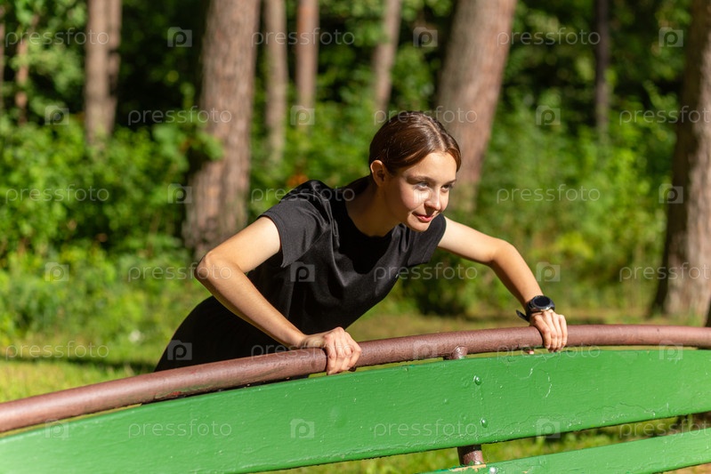 Красивая молодая спортивная женщина в черной футболке, черных шортах и розовых кроссовках разминается, тренируя трицепсы и грудь, отжимаясь от скамейки среди деревьев перед бегом