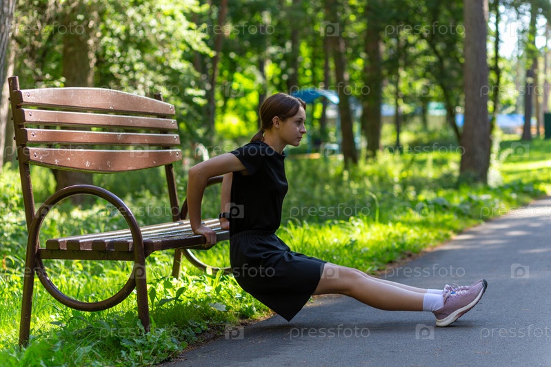 Красивая молодая спортивная женщина в черной футболке, черных шортах и розовых кроссовках разминается, тренируя трицепсы