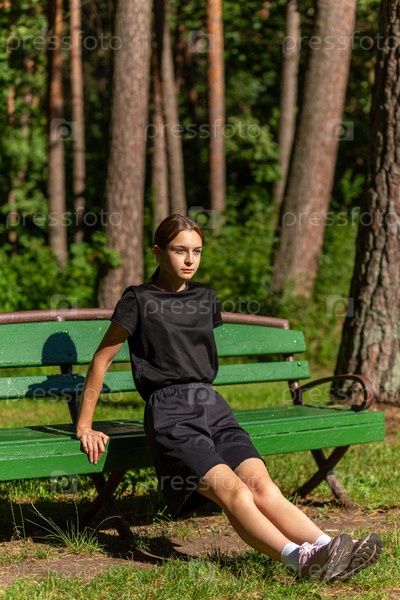 Красивая молодая спортивная женщина в черной футболке, черных шортах и розовых кроссовках разминается, тренируя трицепсы