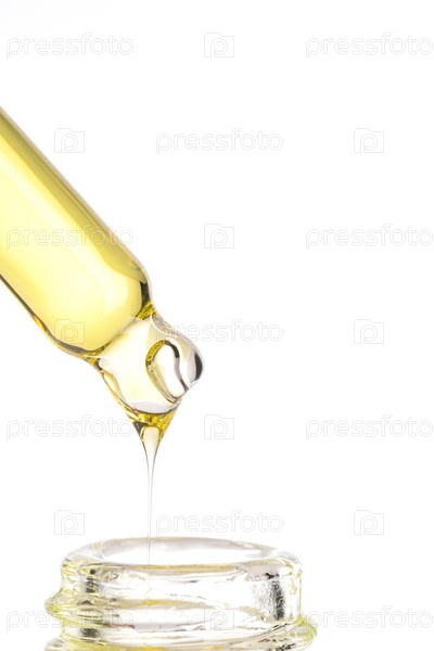 Эфирное масло падает из стеклянной капельницы в стеклянную бутылку. Косметические лабораторные исследования