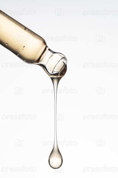 Пипетка с сывороткой, гелем, маслом или другим косметическим продуктом с падающей каплей. Макро крупным планом