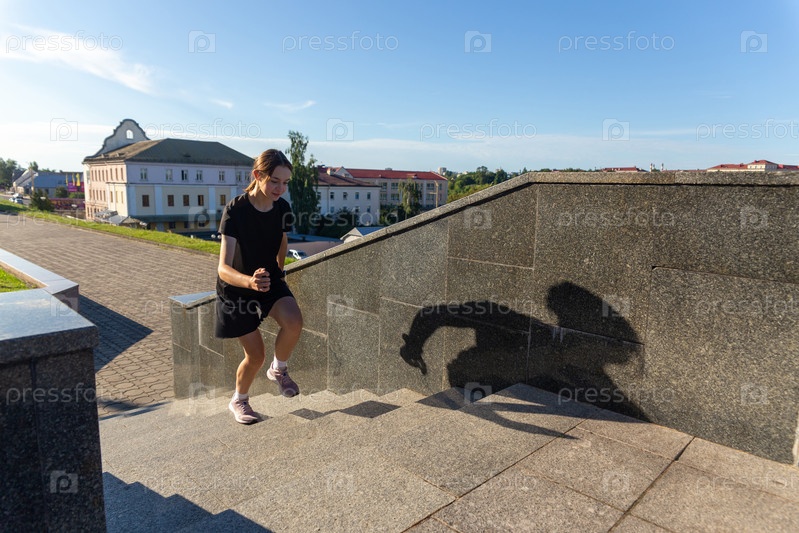 Молодая женщина в черной одежде бежит по лестнице на городской улице рано утром