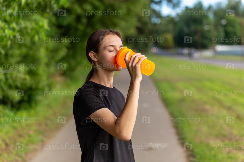 Подходит бегунья-теннаге на открытом воздухе, держа бутылку с водой