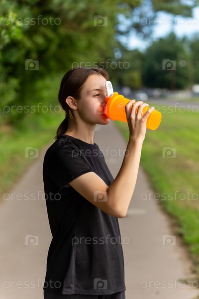 Подходит бегунья-теннаге на открытом воздухе, держа бутылку с водой