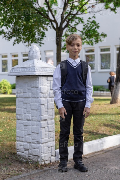 Счастливый мальчик в школьной форме, в белой рубашке и синем жилете с рюкзаком стоит возле школы